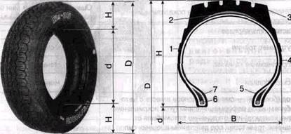 Следует иметь в виду, что ширина профиля (В) связана с шириной обода колеса (б) соотношением 6=0,70...0,75 В, т.е. чем шире шина, тем требуется и более широкое колесо. Например, в случае В=165 мм необходимая ширина обода «б» составляет 115—124 мм или 4,52— 4,90 дюйма. Требуемый типоразмер колеса — 4 ½ или 5 дюймов. Слишком узкое колесо (например, в 4 дюйма) ухудшает устойчивость (управляемость) автомобиля, а слишком широкое колесо (например, в 5½дюйма) ухудшает эластичность шины и отрицательно влияет на ее долговечность.