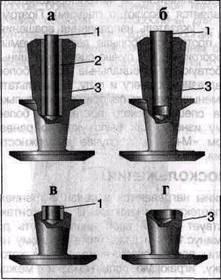 Рис. 12. Конструкция шипов противоскольжения:а — шип с впаянным стержнем; б — шип с запресованным стержнем; в—работоспособный шип визношенном состоянии; г - неработоспособный шип с выпавшим из гнезда остатком стержня;1 – стержень; 2 – припой; 3 - корпус шипа