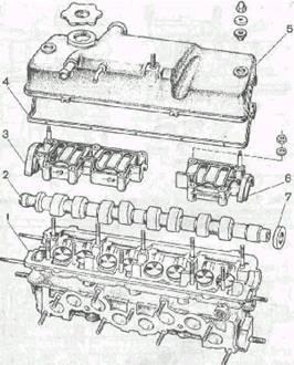 Устройство головки цилиндров: 1 - головка цилиндров; 2 - распределительный вал; 3 - задний корпус подшипников распределительного вала; 4 - прокладка; 5 - крышка головки цилиндров; б - передний корпус подшипников распределительного вала; 7 – сальник.