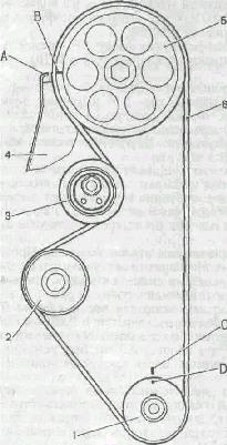 1 - зубчатый шкив коленчатого вала; 2 - зубчатый шкив насоса охлаждающей жидкости; 3 - натяжной ролик; 4 - задняя защитная крышка; 5 - зубчатый шкив распределительного вала; 6 - зубчатый ремень; А - установочный выступ на задней защитной крышке; В - метка на шкиве распределительной вала; С - метка на крышке масляного насоса; D - метка на шкиве ремня шкиве коленчатого вала.