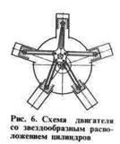 В двигателях со звездообразно расположенными цилиндрами (рис. 6) проще осуществлять воздушное охлаждение, чем в двигателях с цилиндрами, расположенными в ряд. Однако, как правило, шатуны и коленчатые валы звездообразных дви