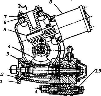 Зацепление сектора 4 с рейкой 5 регулируют изменением числа прокладок 6 под фланцем 7 упора рейки.