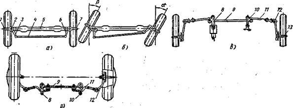 Поворотные кулаки шарнирно соединены с осью шкворнями 2.