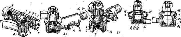 снабженными поджимной штампованной шайбой и конической пружиной. Пружина установлена под заглушкой 11, закрепленной стопорным кольцом в головке и уплотненной резиновым кольцом. Сочленение закрыто резиновым чехлом 14,