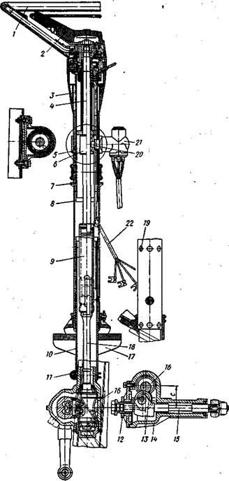 крепления нижней трубы колонки на картере также обеспечивает их взаимное смещение при сильном ударе. Значительное смещение средней трубы колонки в кронштейне 5 вверх при ослаблении его затяжки ограничивается специальным упорным кольцом 7, приваренным на трубе.