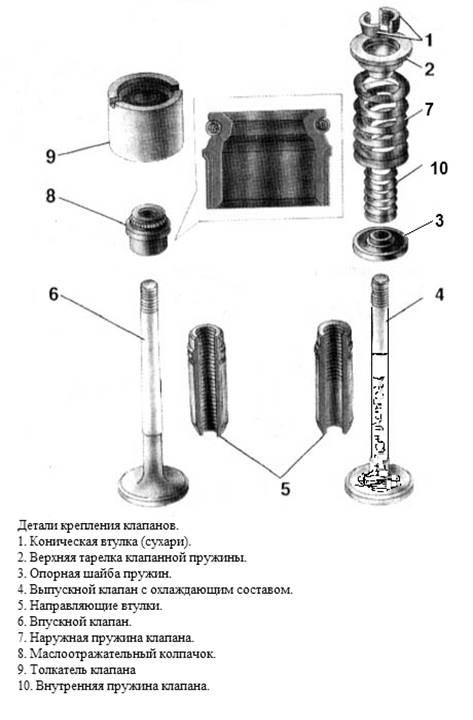 запрессовываются в головку блока, и обеспечивают направленное движение клапана и посадку его в седло без перекоса. В отверстиях под стержни клапанов имеются спиральные канавки для смазки. У втулок выпускных клапанов сквозные канавки, а впускных – на половину длины. На втулки сверху надеваются маслоотражательные колпачки 8