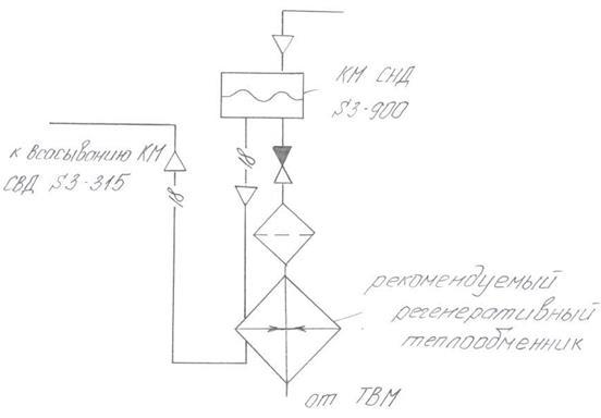 КМ НД засасывает пар хладагента из отделителя жидкости через регенеративный теплообменник и сжимает его до промежуточного давления.