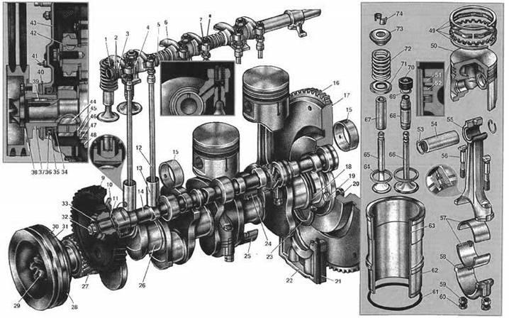 Рис. 1. Устройство КШМ и ГРМ двигателя ГАЗ-24.