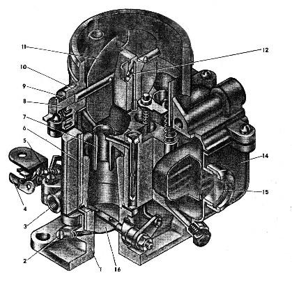 Распылители главных дозирующих систем выведены в малые диффузоры первичной и вторичной камер. Диффузоры запрессованы в корпус поплавковой камеры. В корпусе поплавковой камеры имеется окно 15