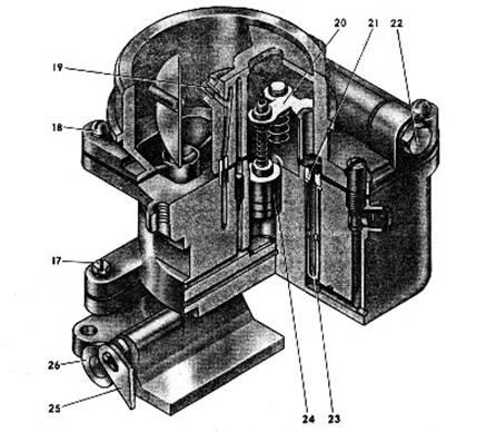 Заслонки удерживаются в закрытом положении пружинами, укрепленными на оси первичной камеры и оси вторичной камеры. Кулиса 25