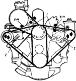 Натяжение ремня 1 привода вентилятора или жидкостного насоса (рис. 4.5) проверяют замером прогиба ремня при нажатии посередине между шкивами с усилием примерно 30-40 Н. Прогиб должен быть в пределах 8-14 мм.