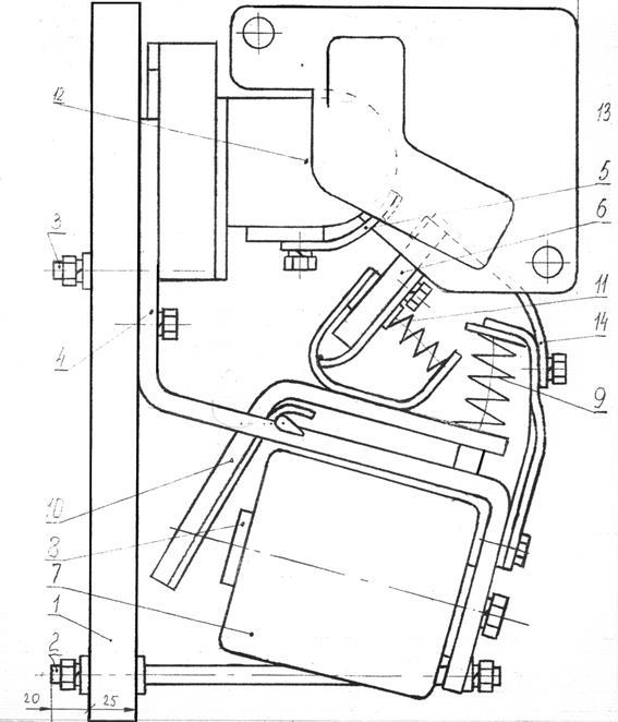 На рисунке 1.1 показано устройство и принцип работы контактора КПВ-604. Крепление к конта кторной панели 1 производится при помощи болтов 2 и 3. Роль основного связующего элемента выполняет ярмо 4, к которому крепится неподвижный контакт 5 с дугогасящим устройством, а также система подвижного контакта 6 с электромагнитным приводом. При возбуждении катушки 7 ее сердечник 8 преодолевает сопротивление возвращающей пружины 9 и притягивает якорь 10, обеспечивая замыкание подвижного контакта с неподвижным. Держатель подвижного контакта обеспечивает возможность некоторого его поворота и скольжения относительно неподвижного контакта, благодаря чему при помощи пружины 11 достигается необходимое притирание. Размыкание контактов происходит при помощи возвращающей пружины после прекращения питания втягивающей катушки. Дугогасительное устройство состоит из дугогасительной катушки 12, дугогасительной камеры 13 и дугогасительных рогов 14.
