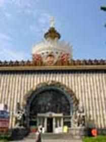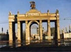 Мы стоим перед Главным входом. Пропилеи монументального Главного входа достигают 25 метров высоты. Аллея, по сторонам которой установлено 14 фонтанов в виде чаш из красного гранита, подводит к центральному павильону. (посмотрите прямо) Он построен в лучших традициях русской архитектуры. Три его яруса, украшенные колоннадами, завершаются шпилем с золотой звездой диаметром 3,5 метра. Высота павильона со шпилем – 90 метров. Его экспозиция отражает важнейшие вехи социалистического строительства. Далее мы проходим к площади Дружбы Народов, на которой установлен фонтан Дружбы Народов. Этот фонтан был сооружён по проекту Г.Д. Константиновского и К.Т. Топуридзе. Позолоченные бронзовые фигуры девушек с дарами земли в руках символизируют дружную семью советских республик. Каждую секунду фонтан выбрасывает в воздух более тонны воды на высоту восьмиэтажного дома. Своеобразная экспозиция по истории советской архитектуры – ансамбль площади Дружбы народов.