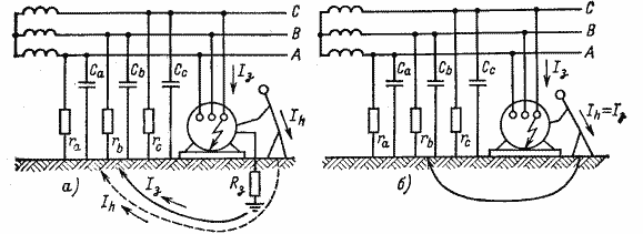 Прикосновение к заземленным нетоковедущим частям, оказавшимся под напряжением. Указанные части электроустановок (корпуса, оболочки, кабеля) могут оказаться под напряжением лишь случайно в результате повреждения изоляции. При случайном касании этих частей человек будет находиться под воздействием напряжения прикосновения (рис.2). Напряжение прикосновения - это напряжение между двумя точками цепи тока, которых одновременно касается человек (ГОСТ 12.1.009). При прикосновении человека к заземленному корпусу, имеющему контакт с одной из фаз, часть тока замыкания на землю будет проходить через человека, а если корпус не заземлен, то через человека проходит весь ток замыкания на землю (однополюсное прикосновение).
