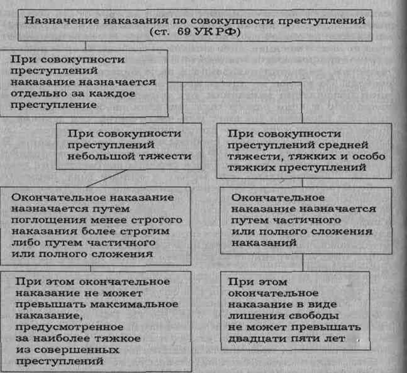 Согласно ч. 1 ст. 69 УК РФ при совокупности преступлений наказание назначается отдельно за каждое из них. Что касается определения основного окончательного наказания по совокупности, то порядок назначения и его пределы различаются в зависимости от принадлежности преступлений ее (совокупность) образующих к категории деяний небольшой тяжести, средней тяжести, тяжких или особо тяжких.[6]