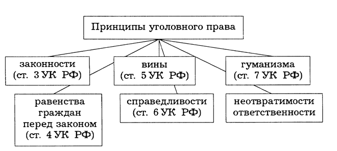 В УК РФ законодательно сформулированы следующие принципы уголовного права: законности, равенства граждан перед законом, вины, справедливости, гуманизма. Принцип