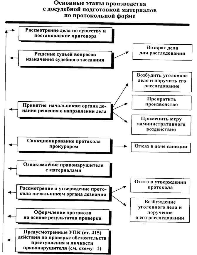 В соответствии со ст. 415 УПК по делам о преступлениях, перечисленных в ст. 414 УПК, эти органы не позже чем в десятидневный срок после получения информации о совершенном правонарушении, устанавливают его обстоятельства, данные о личности виновного, получают от него объяснения, опрашивают очевидцев содеянного, истребуют справку о наличии или отсутствии судимости у правонарушителя, характеристику с места его работы, учебы и места жительства и другие материалы, имеющие значение для рассмотрения дела в суде (см. схему 1).