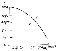 на окружающую среду, человека и растительность рекомендовала пользоваться графиком, приведенным на рис. [10]. Из него следует, что при небольших концентрациях SO2
