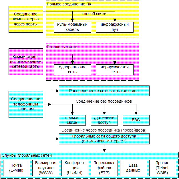 Рисунок 1 - Способы коммутации компьютеров и виды сетей.