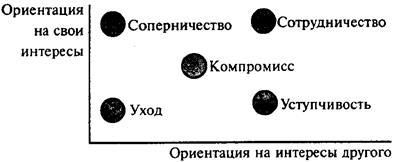 Каждая из этих возможностей предполагает соответствующие стратегии поведения участников конфликта. Один из используемых в конфликтологии практических подходов к классификации стратегий конфликтного взаимодействия (авторы У. Томас и Р. Килмен) берет за основу степень ориентации участников ситуации на свои собственные интересы и на сохранение взаимоотношений, и на основании этих двух переменных выделяет пять видов стратегий (см. схему).