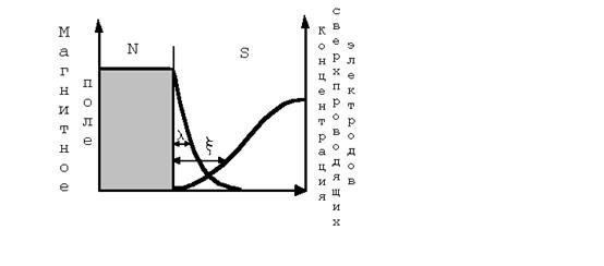 Построим рисунок, изображающий магнитное поле и квадрат волновой функции (концентрацию) сверхпроводящих электронов на границе сверхпроводящей и нормальной областей. Ход магнитного поля характеризуется экспоненциальной зависимостью от расстояния до границы, и мерой быстроты спада магнитного поля является глубина проникновения l. Аналогично изменяется - но в противоположную сторону - квадрат волновой функции; мера быстроты ее изменения получила название длины когерентности: обычно ее обозначают x.