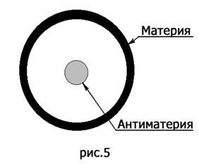 Я ни в одном источнике не нашел данных о том в каком состоянии получают частицы антиматерии: в состоянии покоя или подвижном. Думаю, что в подвижном, и скорости их движения хватало на то чтобы преодолеть силу отталкивания от материи и саннигилировать. С этой точки зрения можно предположить, что если разместить полученное в состоянии покоя некоторое количество вещества антиматерии внутри сферы, состоящей из обычной материи (рис. 5), то антиматерия должна будет удерживаться в центре сферы (в центре сил взаимоотталкивания) за счет действия сил антигравитации.