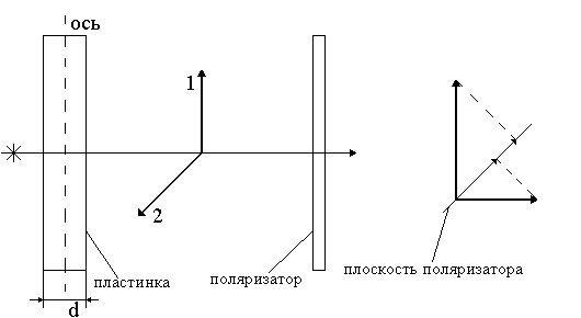 Таким образом, если пропустить естественный свет через вырезанную параллельно оптической оси кристаллическую пластинку толщины (рис. 11,а), из пластинки выйдут два поляризованных во взаимно перпендикулярных плоскостях луча и , между колебаниями которых будет существовать разность фаз (рис. 11,б).