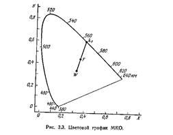 Упрощенная цветовая характеристика объекта возможна и в двухмерной форме — точкой на цветовом графике МКО (рис. 3.3). Значение цветовых индексов источника (координат х и у) позволяет найти две его важнейшие характеристики: цветовую тональность, определяемую доминирующей длиной волн излучения (λf