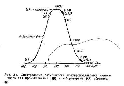 Исторически освоение цветовой гаммы идет справа налево: от красного, через оранжевый и желтый к зеле-ному. Это было связано со значительными успехами в области технологии синтеза GaAsP и GaP. Наиболь-шие принципиальные трудности вызывает получение синего света, однако следует заметить, что когда эти трудности будут преодолены, то такой материал, как GaN,