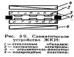 Устройство жидкокристаллического индикатора (рис. 3.9) достаточно просто, здесь удобно реализуюгся современные плоские панельные конструкции. Для получения низких управляющих напряжений (единицы вольт) зазор между пластинами должен быть небольшим (~10-3