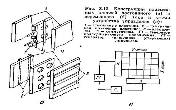 В конструкциях рис. 3.12 центральная мозаичная пластина служит для изоляции разрядных промежутков друг от друга, ею определяется разрешающая способность экрана, близкая к 10 ... 20 лин/см. Ограничения области разряда можно добиться и без перегородок повышением давления газовой смеси, которое ведет к стягиванию плазменного шнура, возникающего в месте пересечения возбужденных X- и У-электродов. Идя по этому пути, можно существенно повысить разрешающую способность,