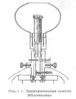 Электрический свет интернационален по месту своего рождения. В его открытии и создании участвовали выдающиеся учёные и изобретатели из многих стран мира. Первый этап разработки электрических источников света благодаря открытиям и изобретениям Деви, Вольта, Петрова, Мольена, Габела, Адамаса, Шпренгеля, Ладыгина, Яблочкова, Дедриксона и других завершился в 1879г. Созданием Эдисоном лампы накаливания в привычном для нас конструктивном виде. Первые публичные установки электрического освещения появились в конце 19 века в странах Западной Европы, в Америке и России. Электрическая «свеча Яблочкова» произвела сенсацию в Париже и была названа «русским светом» (рис.1.1).
