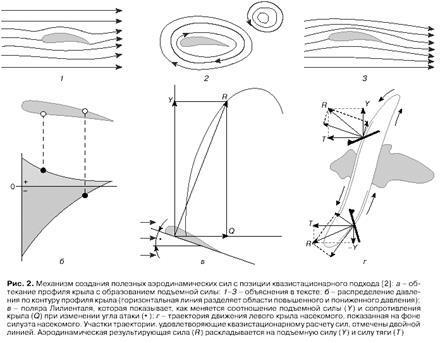 В соответствии с этим подходом обтекание крыла, совершающего взмахи, рассматривается как последовательность отдельных стационарных ситуаций, когда изменениями угла атаки и скорости набегающего потока можно пренебречь. Моментов, удовлетворяющих квазистационарному подходу, в цикле взмаха два: один из моментов приходится на большую часть нисходящей ветви траектории, другой на нижнюю треть восходящей (рис. 2, г). При движении вниз крыло создает подъемную силу и тягу, при махе вверх – тягу и отрицательную подъемную силу. Создает ли крыло какие – либо силы в другие фазы взмаха, неизвестно, так как процессы, происходящие в верхней и нижней точках траектории, не поддаются описанию с позиции квазистационарного подхода.