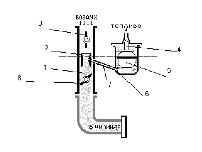 1- Смесительная камера; 2- Диффузор; 3- Воздушная заслонка; 4- Запорная игла; 5- Поплавок; 6- Жиклёр; 7- Распылитель; 8- Дроссельная заслонка.