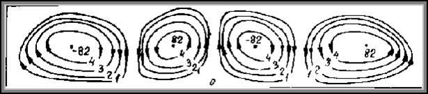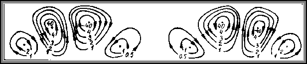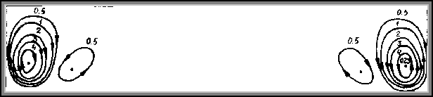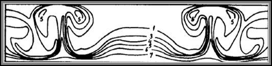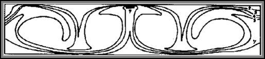 Приведенные выше результаты относятся к развитию конвективных возмущений, первоначально зарождающихся вблизи торцов. Эти возмущения создавались ошибками округления при вычислении температуры на теплоизолированных (торцевых) участках границы. В результате переходного процесса формируется симметричная относительно вертикальной оси полости система конвективных вихрей (рис.4.3.).