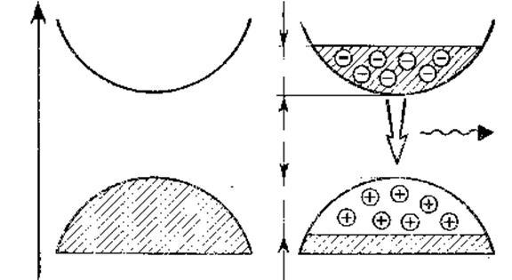 Принцип работы полупроводникового лазера может быть объяснен следующим образом. Согласно квантовой теории электроны в полупроводнике могут занимать две широкие энергетические полосы (рис. 8). Нижняя представляет собой валентную зону, а верхняя – зону проводимости. В нормальном чистом полупроводнике при низкой температуре все электроны связаны и занимают энергетический уровень, расположенный в пределах валентной зоны. Если на полупроводник подействовать электрическим током или световыми импульсами, то часть электронов перейдет в зону проводимости. В результате перехода в валентной зоне окажутся свободные места, которые в физике называют «дырками». Эти дырки играют роль положительного заряда. Произойдёт перераспределение электронов между уровнями валентной зоны и зоны проводимости, и можно говорить, в определенном смысле, о перенаселенности верхней энергетической зоны.