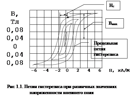 яженности постоянного магнитного поля от 0 до +Н, от +Н до –Н и снова от –Н до +Н кривая изменения индукции (кривая перемагничивания) имеет форму замкнутой кривой – петли гистерезиса. Для слабых полей петля имеет вид эллипса (рис 1.1). При увеличении значения напряженности магнитного поля Н получают серию заключенных одна в другую петель гистерезиса. Когда все векторы намагниченности доменов сориентируются вдоль направления поля, процесс намагничивания закончится состоянием технического насыщения намагниченности материала. Петлю гистерезиса, полученную при условии насыщения намагничивания, называют предельной петлей