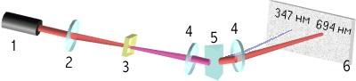 1 - рубиновый лазер; 2 - линза; 3 - ячейка с бензолом; 4 - экран Цвета показаны условно.