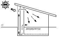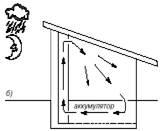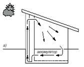 Неравномерность солнечной радиации в течение дня, а также желание обогревать дом ночью и в пасмурный день диктует необходимость устройства теплового аккумулятора. Днем он накапливает тепловую энергию, а ночью отдает. Для работы с воздушным коллектором наиболее рациональным считается гравийно-галечный аккумулятор. Он дешев, прост в строительстве. Гравийную засыпку можно разместить в теплоизолированной заглубленной цокольной части дома. Теплый воздух нагнетается в аккумулятор с помощью вентилятора.