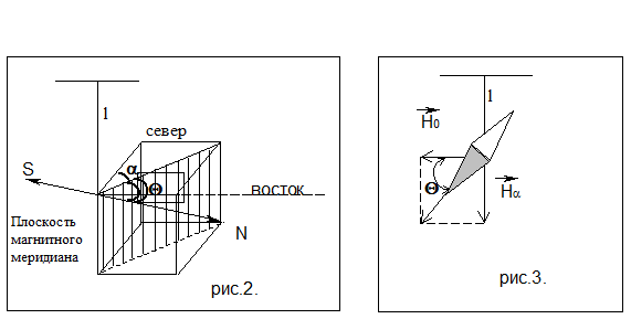 (рис. 2). Вектор полей напряжёности магнитного поля Земли можно разложить на две составляющие: горизонтальную и вертикальную (рис. 3). Значение углов наклонения и склонения, а также горизонтальной составляющей дают возможность определить величину и направление полной напряжённости магнитного поля Земли в данной точке. Если магнитная стрелка может свободно вращаться лишь вокруг вертикальной оси, то она будет устанавливаться под действием горизонтальной составляющей магнитного поля Земли в плоскости магнитного меридиана. Горизонтальная составляющая , магнитное склонение a