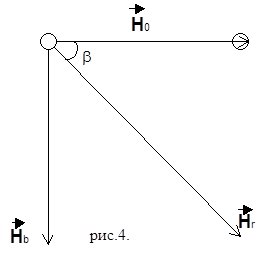 , направленное перпендикулярно к плоскости катушки. Т.о., на стрелку будут действовать два взаимно перпендикулярных поля: магнитное поле Земли и магнитное поле тока. Напряжённости обеих полей взаимно перпендикулярны. На рис. 4. изображено сечение катушки горизонтальной плоскостью. Здесь – вектор напряжённости поля, созданного круговым током, – горизонтальная составляющая магнитного поля Земли. Стрелка установится по направлению равнодействующей , т.е. по диагонали параллелограмма, сторонами которого будут вектор напряжённости магнитного поля кругового тока  и .Рассматривая рис.4 получим: