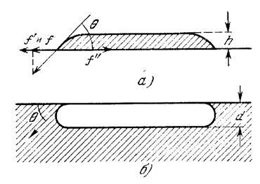 Рассмотрим теперь воздушный пузырек в той же жидкости (рис. 10,6). Если пузырек достаточно велик, чтобы его «дно» было плоским, то рассуждения, подобные только что приведенным, показывают, что условием равновесия пузырька будет равенство