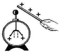 (Слабо натираю эбонитовую палочку о мех и касаюсь ею металлического стержня электроскопа.)