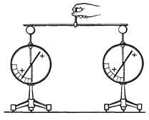 2. Также берём два электроскопа. Один заряжен, а другой нет, соединяю их длинной деревянной линейкой. . Обратите внимание на то, что опять заряд с заряженного электроскопа перетекает на незаряженный.
