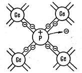 Рис.4 заменить в узлах кристаллической решетки атомами, валентность которых отличается на единицу от валентности основных атомов. На рис. 4 условно изображена решетка германия с примесью 5-валентных атомов фосфора. Для образования ковалентных связей с соседями атому фосфора достаточно четырех электронов. Следовательно, пятый валентный электрон оказывается как бы лишним и легко отщепляется