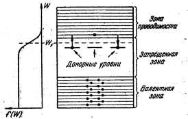 Уровень Ферми в полупроводнике n-типа лежит между донорными уровнями и дном зоны проводимости, при невысоких температурах — приблизительно посредине между ними (рис. 5).