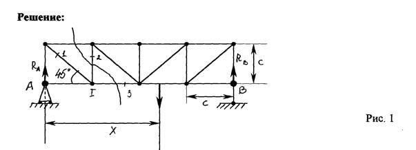 ) . Составим условия равновесия, учитывая, что нагрузка движется слева направо, а "х" есть изменение расстояние от опоры до узла, в котором приложена сила. Найдем усилия в стержнях для случая, когда 0<=х=>с