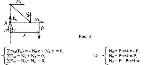 наиболее опасно положение груза при х= с, тогда абсолютное значение усилия N3