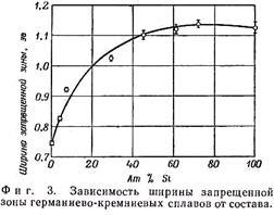 Ширина запрещенной зоны определялась оптическим методом на образцах, имеющих одинаковую толщину, равную 0,50 мм. Ширина запрещенной зоны была принята равной энергии, соответствующей величине поглощения, которой обладает германий при принятой ширине запрещенной зоны (0,72 ЭВ). В этой точке коэффициент абсорбции был равен 22,7 см-1