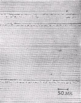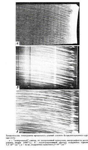 в отражениях типа 220 (от плоскостей, параллельных направлению роста) либо в отражениях 400 (от плоскостей, перпендикулярных направлению роста, в тех случаях, когда было необходимо подчеркнуть полосчатость, обусловленную неравномерным распределением примеси). Чтобы проявить распределение микродефектов, образцы декорировались медью и золотом, при этом картина распределения была сходная в обоих случаях.